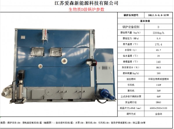 1.SHL2.2-0.8-SCI全自动生物质蒸汽锅炉,采用自然循环锅炉原理,受热面采用整体螺旋翅片管,烟气折返,布有辐射受热面、对流受热面、节能器、空气预热器等,炉排采用多极调速,调整方便,运行稳定可靠排尘度低,达到国家-类地区标准,具有结构简单、热效率高、排烟温度低等特点。