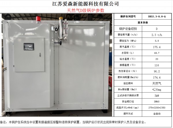 1.SHS2.3-0.8-Q全自动燃气蒸汽锅炉,采用双锅简横置式形式,主要部件有本体受压件、常压节能器,锅炉受压件几何容积为49.6升,辐射及对流受热面采用整体螺旋翅片管,具有结构简单、热效率高、排烟温度低等特点。